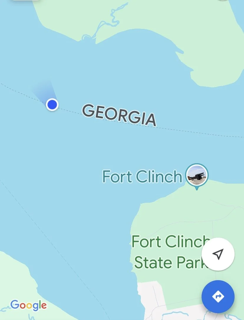 Thursday, March 28. We crossed the Georgia state line. Woo hoo!!! Had to take a photo of our blue dot.